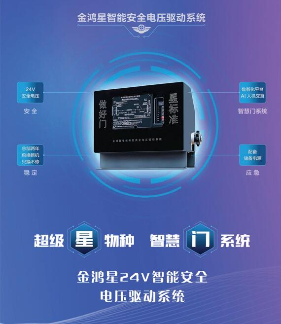 金鴻星超級(jí)星物種—智慧門系統(tǒng)擁有獨(dú)立的安 全電壓轉(zhuǎn)換系統(tǒng),將 220V 電壓轉(zhuǎn)為 24v 安全電壓 低壓運(yùn)行系統(tǒng),有效解決傳統(tǒng)戶外電動(dòng)門 220v 電 壓不安全,36v 電壓運(yùn)行不穩(wěn)定等痛點(diǎn),在性能, 安全和控制系統(tǒng)上全面升級(jí)。 從根源上杜絕了漏電 隱患,成功推動(dòng)低壓系統(tǒng)進(jìn)入一個(gè)全新階段,開啟 低壓電機(jī)驅(qū)動(dòng)系統(tǒng)智能化 2.0 時(shí)代。