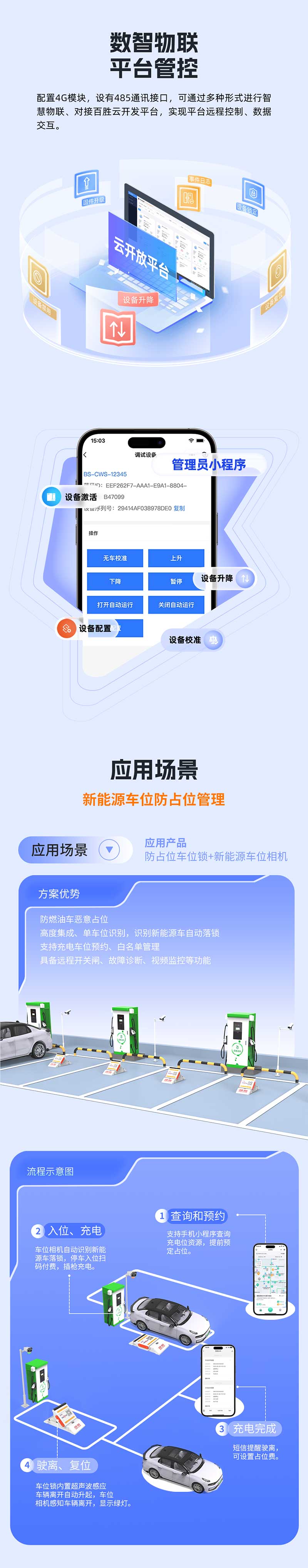 1、機電一體穩(wěn)定耐用:機電一體、模塊化設(shè)計,集成車位鎖控制器、通訊模塊,具有設(shè)備安裝便捷、維護成本低、施工周期短、適用性高特性。