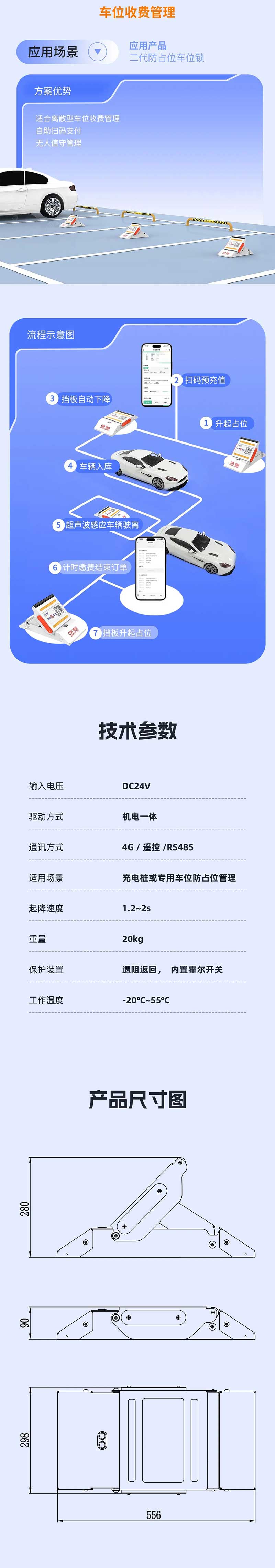 4、運行平穩(wěn)噪音更低:二代防占位車位鎖運行流暢,升降穩(wěn)定,使用噪音低至55dB,減少對環(huán)境的干擾。