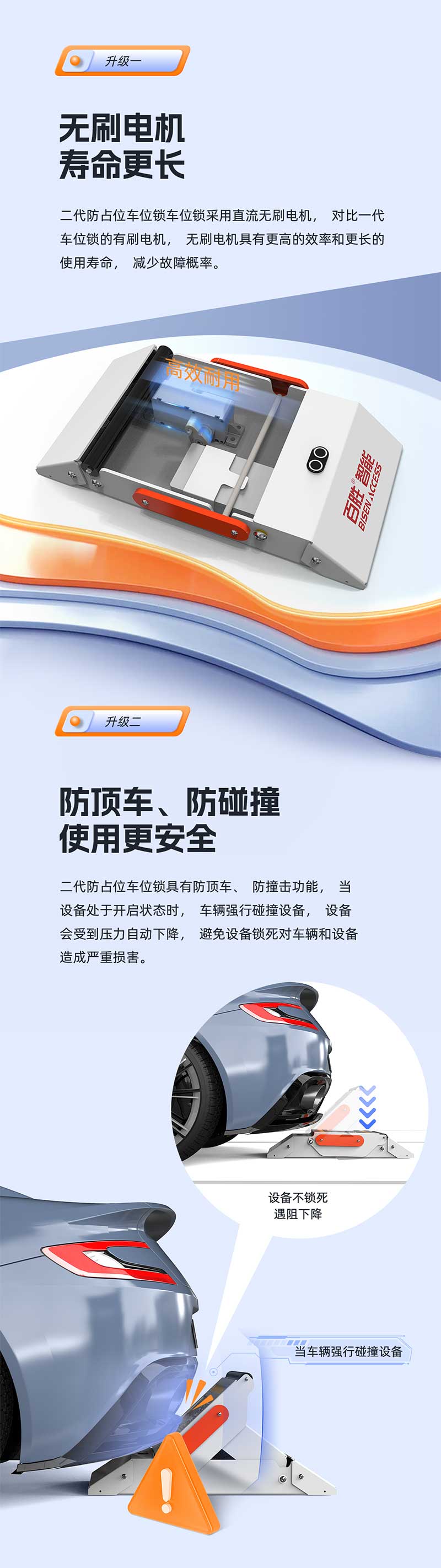 1、無刷電機壽命更長:二代防占位車位鎖車位鎖采用直流無刷電機,對比一代車位鎖的有刷電機,無刷電機具有更高的效率和更長的使用壽命,減少故障概率。