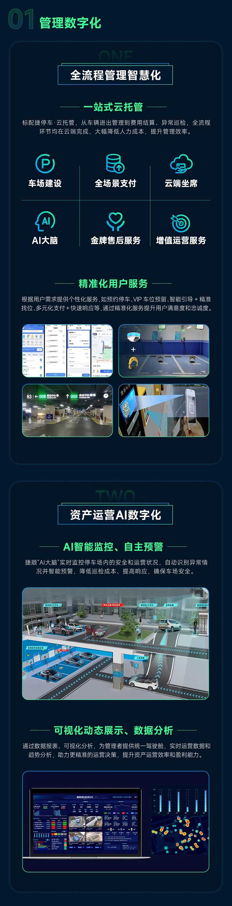 全流程管理智慧化:一中式云托管。標(biāo)配捷停車·云托管,從車輛進(jìn)出管理到費(fèi)用結(jié)算、異常巡檢,全流程環(huán)節(jié)均在云端完成,大幅降低人力成本,提升管理效率;精準(zhǔn)化用戶服務(wù),根據(jù)用戶需求提供個性化服務(wù),如預(yù)約停車.VIP車位預(yù)留.智能引導(dǎo)+精準(zhǔn)找位、多元化支付+快速響應(yīng)等,通過精準(zhǔn)化服務(wù)提升用戶滿意度和忠誠度。