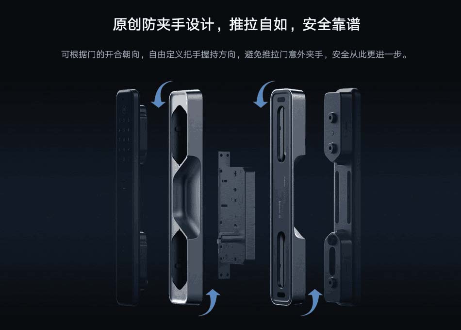 小米智能門鎖M20 采用高強(qiáng)度合金中框與一體化IML 工藝完美契合,正面黑晶面板上的隱形觸控按鍵和指示燈,讓整個(gè)門鎖渾然一體。無論是正面還是側(cè)面,M20 將小米的簡(jiǎn)約風(fēng)格做到了極致。創(chuàng)新地采用了單邊內(nèi)凹防夾手把手設(shè)計(jì),可根據(jù)門的開合朝向,自定義把手的握持方向,避免推拉門意外夾手。