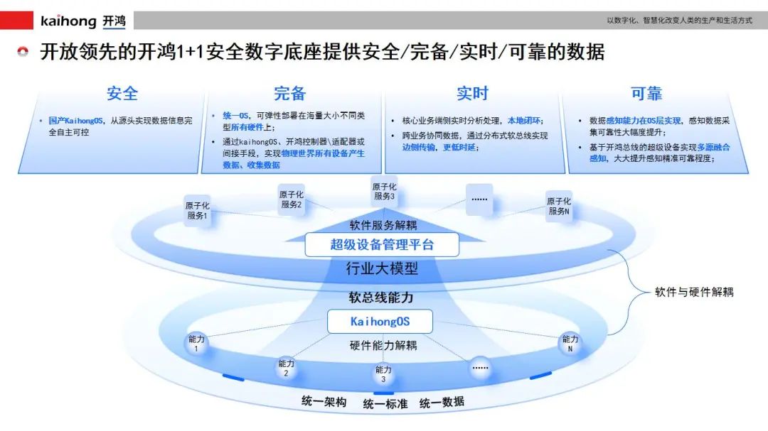 其次,數(shù)字化本身的轉(zhuǎn)型,核心一定是數(shù)據(jù),需要采集到物理世界的高質(zhì)量的數(shù)據(jù)非常重要。開源鴻蒙本身目前是實現(xiàn)物理世界數(shù)據(jù)采集最好的手段,因為這個系統(tǒng)本身有兩個特點,第一,這個系統(tǒng)幾乎能裝在所有的硬件設備上;第二,設備數(shù)據(jù)產(chǎn)生的控制權(quán)或者是決定權(quán)全在系統(tǒng)。所以基于開源鴻蒙,就意味著人們能拿到最安全、最完備、最可靠、最實時的數(shù)據(jù)。有了這個數(shù)據(jù)以后,再在上面疊加行業(yè)領域AI大模型等創(chuàng)新應用,才真正能實現(xiàn)數(shù)字化。