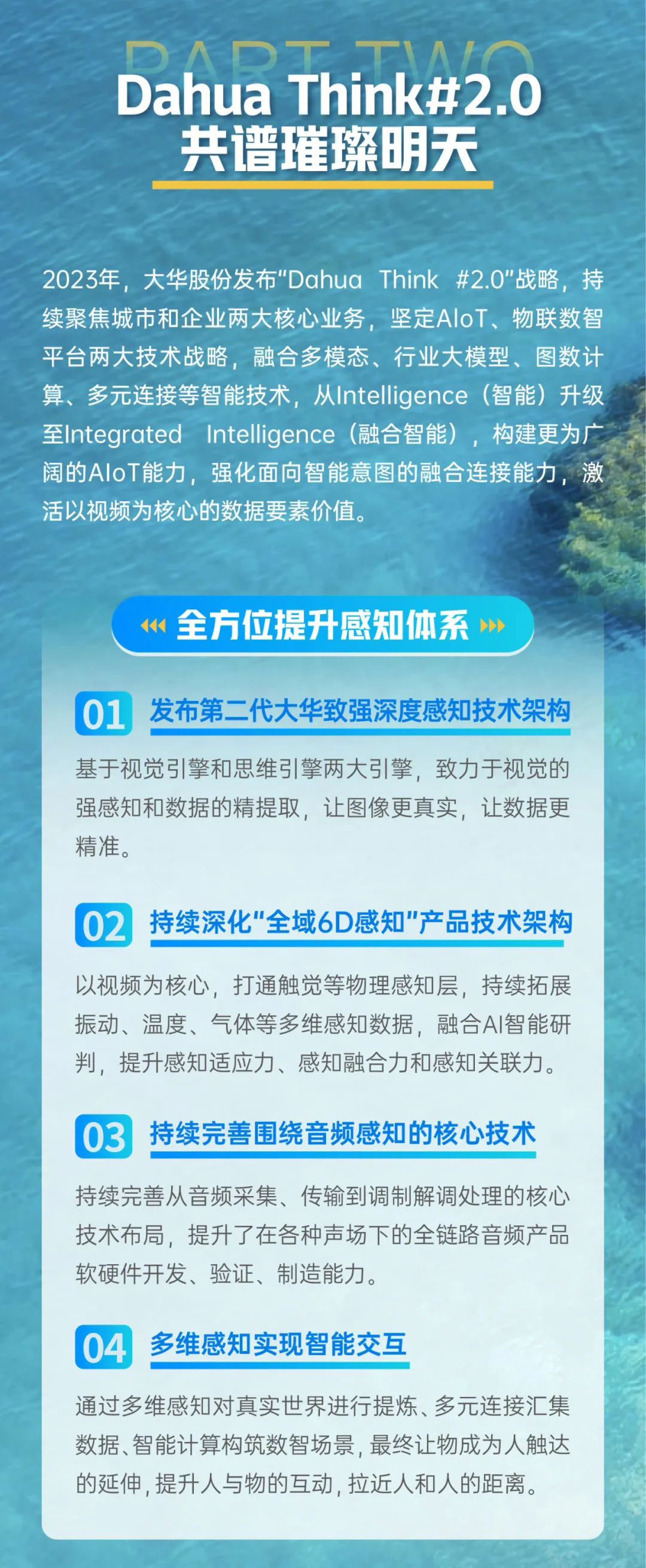 2023年,大華股份發(fā)布"Dahua Think #2.0"戰(zhàn)略,持續(xù)聚焦城市和企業(yè)兩大核心業(yè)務(wù),堅定AloT、物聯(lián)數(shù)智平臺兩大技術(shù)戰(zhàn)略,融合多模態(tài)、行業(yè)大模型、圖數(shù)計算、多元連接等智能技術(shù),從Intelligence (智能)升級至lntegrated lntelligence(融合智能),構(gòu)建更為廣闊的AIoT能力,強化面向智能意圖的融合連接能力,激活以視頻為核心的數(shù)據(jù)要素價值。
