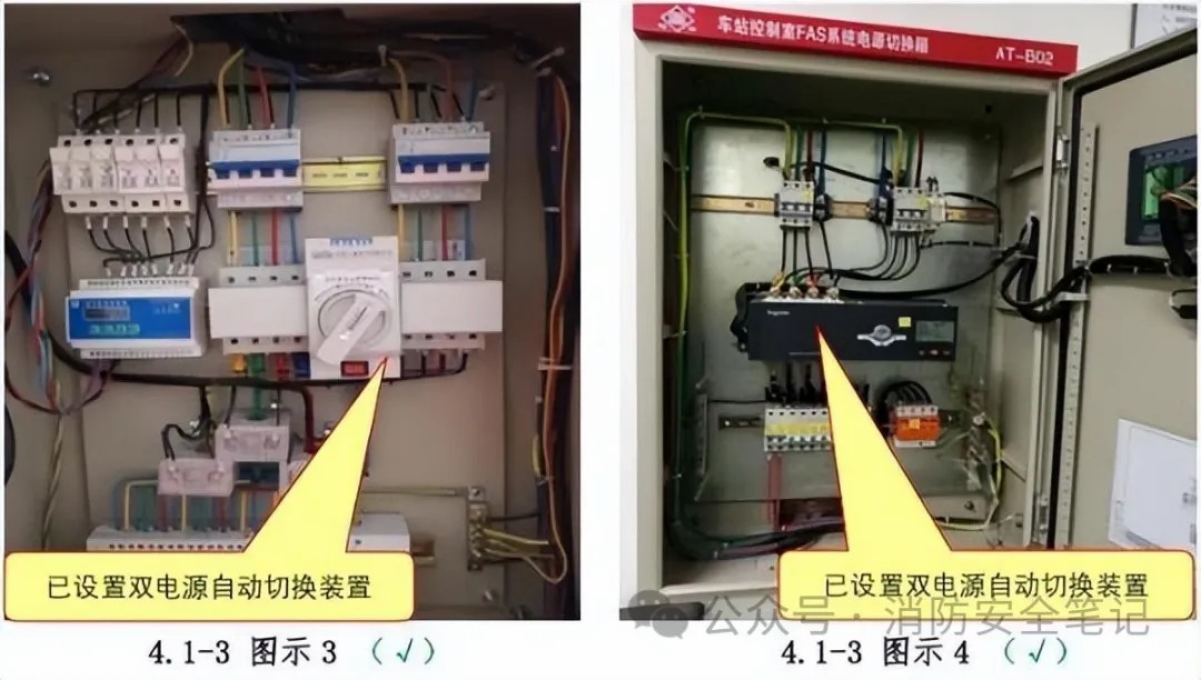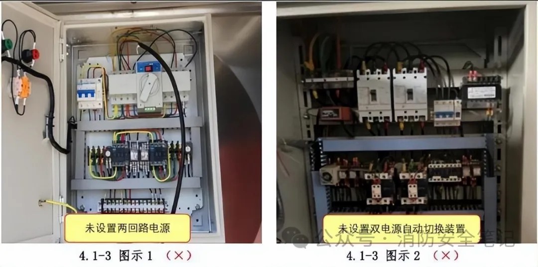 問題描述: 消防控制室、消防水泵房、防煙和排煙風(fēng)機房的消防用電設(shè)備及消防電梯等的供電,未在其配電線路的最末一級配電箱處設(shè)置兩回路電源或未設(shè)置自動切換裝置(負荷等級為三級的消防設(shè)備除外)【圖示1]【圖示2]