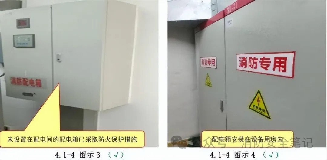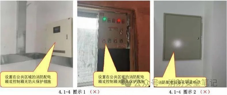 問題描述: 1)按一、二級負荷供電的消防設(shè)備,其配電箱未獨立設(shè)置;[圖示1]2) 設(shè)置在公共區(qū)域的消防設(shè)備配電箱或控制箱無防火保護措施;【圖示1]3)消防配電設(shè)備未設(shè)置明顯標(biāo)志?!緢D示2]