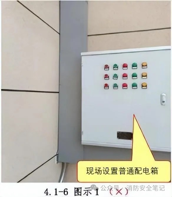 原因分析: 1.配電箱未設(shè)置在配電間且無防火保護措施,當(dāng)箱體內(nèi)溫度達到200℃及以上時,箱內(nèi)電器元件的外殼就會變形跳閘,不能保證消防供電;2.施工單位對相關(guān)規(guī)范不熟悉,僅考慮到方便施工或節(jié)約成本等原因而忽略了消防配電箱防火保護措施和消防配電設(shè)備標(biāo)識的重要性。相關(guān)規(guī)范: ☆《建筑設(shè)計防火規(guī)范》(GB50016-2014<2018版>)第10.1.9條。【圖示3]【圖示4]【圖示5]正確做法: