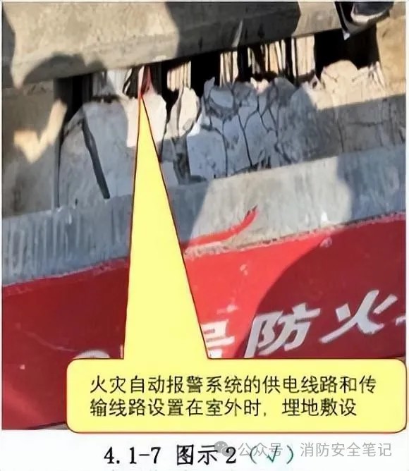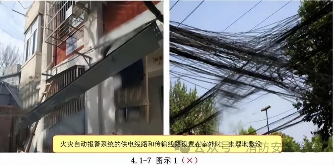 問題描述: 火災(zāi)自動報警系統(tǒng)的配電線路與傳輸線路設(shè)置在室外時,未埋地敷設(shè),不符合規(guī)范要求?!緢D示1]