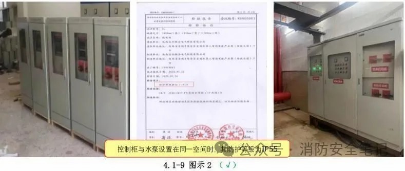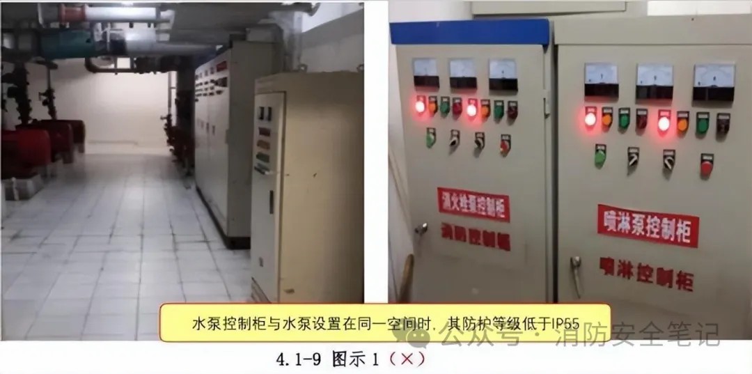 問題描述: 1)消防水泵控制柜與消防水泵設(shè)置在同一空間時,其防護等級低于IP55。【圖示1】