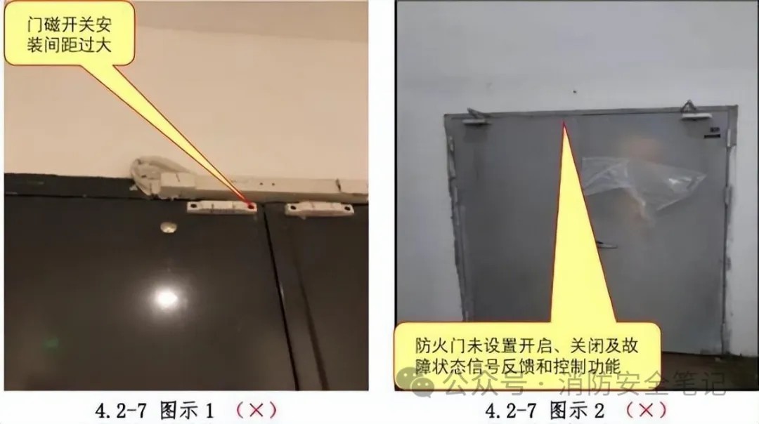問題描述: 1)防火門監(jiān)控系統(tǒng)門磁開關(guān)安裝間距過大;【圖示1]2)按規(guī)范規(guī)定的具有信號反饋功能的防火門無開啟、關(guān)閉及故障狀態(tài)信號反饋和控制功能。[圖示2]