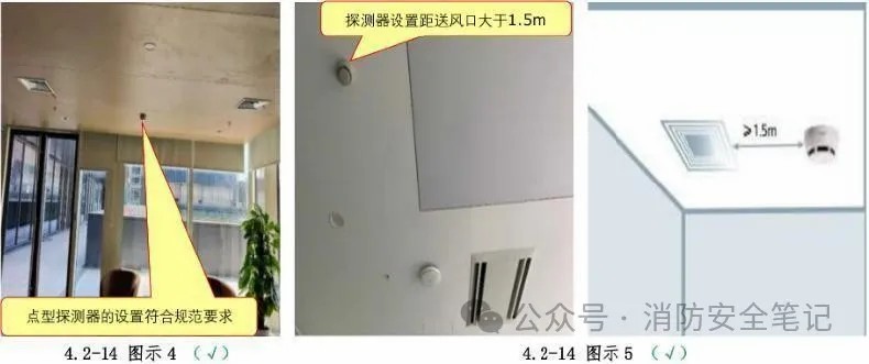 問題描述: 現(xiàn)場點型探測器設(shè)置不符合規(guī)范要求的有:1)點型探測器與照明燈間距過小【圖示1];2) 點型探測器至墻壁的水平距離小于0.5m[圖示2]:3)點型探測器距空調(diào)送風(fēng)口邊的水平距離小于1.5m[圖示3]。