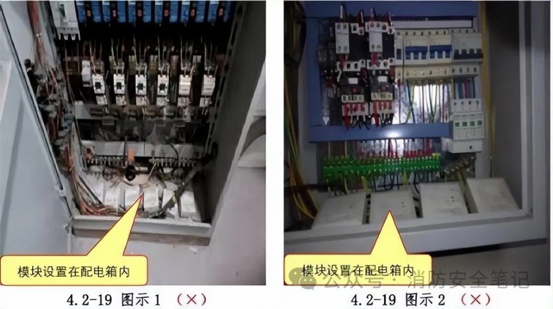 原因分析: 1)設(shè)計圖紙未設(shè)置模塊箱,施工單位圖省事直接將模塊設(shè)置在配電(控制)柜(箱)內(nèi);2)責(zé)任主體未認識到模塊設(shè)置在配電(控制)柜(箱)內(nèi)的潛在危險性,在施工過程中圖方便、節(jié)約成本,直接放在配電箱中。相關(guān)規(guī)范: ☆《火災(zāi)自動報警系統(tǒng)設(shè)計規(guī)范》(GB50116-2013)第6.8.1條、第6.8.2條?!緢D示3]【圖示4]。正確做法: