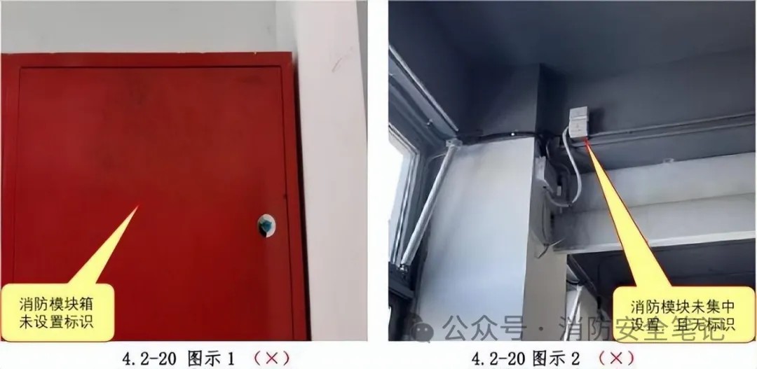 問題描述: 消防模塊或模塊箱未按規(guī)定設(shè)置標(biāo)識,不便于后期消防人員維修查找。【圖示1]【圖示2】。