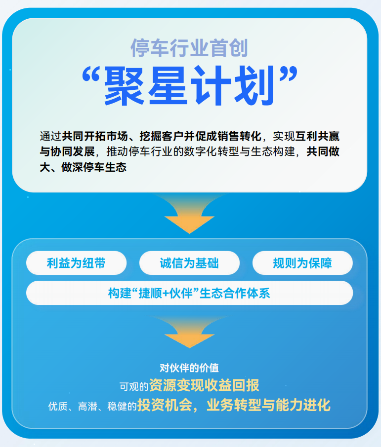 9月27日,捷順科技正式對(duì)外宣布,推出行業(yè)首創(chuàng)生態(tài)合作伙伴“聚星計(jì)劃”?!熬坌怯?jì)劃”的核心理念在于開放合作、互利共贏。捷順認(rèn)為,停車資產(chǎn)數(shù)字化運(yùn)營(yíng)管理的廣闊市場(chǎng)需要各界力量的共同參與和推動(dòng)。因此,“聚星計(jì)劃”誠(chéng)邀各界精英加盟,以停車資產(chǎn)數(shù)字化運(yùn)營(yíng)管理為“利劍”,共同開辟市場(chǎng),挖掘客戶,實(shí)現(xiàn)銷售轉(zhuǎn)化,共享發(fā)展成果。