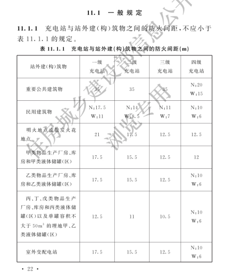 對(duì)于遭受充電樁設(shè)備噪音影響的居民住戶(hù)來(lái)說(shuō),他們投訴和解決噪音問(wèn)題的訴求是有法可依的。根據(jù)住房城鄉(xiāng)建設(shè)部發(fā)布的國(guó)家標(biāo)準(zhǔn)《電動(dòng)汽車(chē)充電站設(shè)計(jì)規(guī)范》中的相關(guān)規(guī)范要求,對(duì)于汽車(chē)充電站與建筑物之間的間距如表: