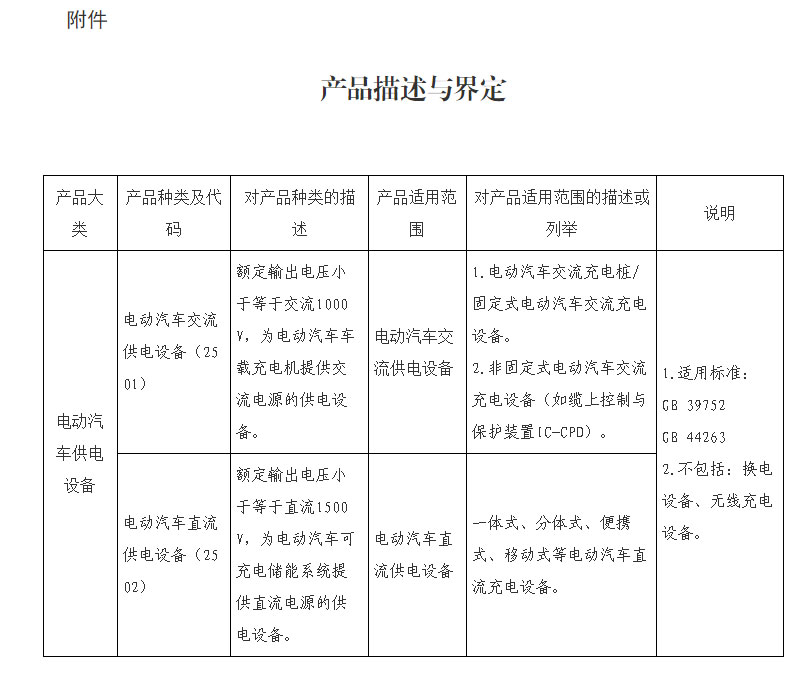 額定輸出電壓小于等于交流1000V的電動(dòng)汽車交流供電設(shè)備,如電動(dòng)汽車交流充電樁、固定式電動(dòng)汽車交流充電設(shè)備、非固定式電動(dòng)汽車交流充電設(shè)備等;以及額定輸出電壓小于等于直流1500V的電動(dòng)汽車直流供電設(shè)備,如一體式、分體式、便攜式、移動(dòng)式等直流充電設(shè)備,但不包括換電設(shè)備、無線充電設(shè)備。