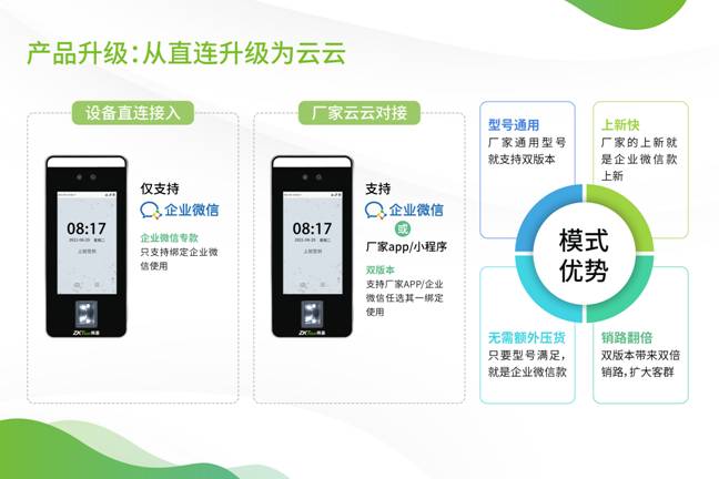 “云云直連”模式讓設備型號天然支持企業(yè)微信功能,合作伙伴以及服務商無需為不同版本額外備貨,降低庫存壓力,優(yōu)化供應鏈管理。