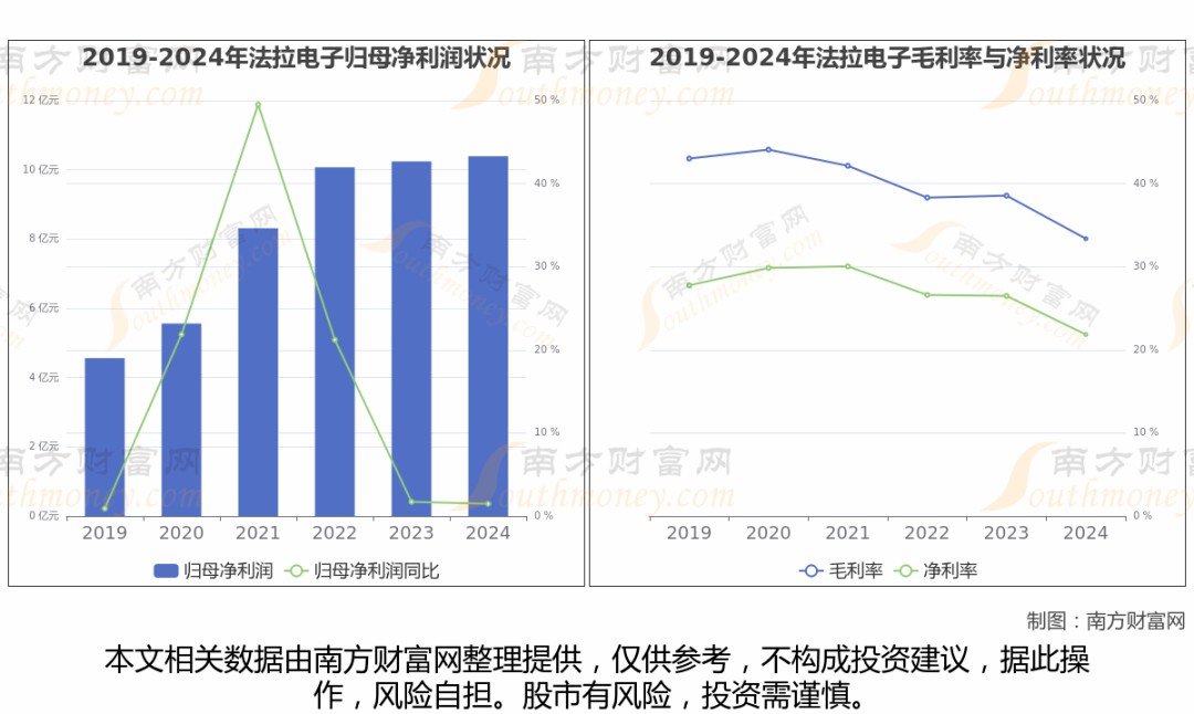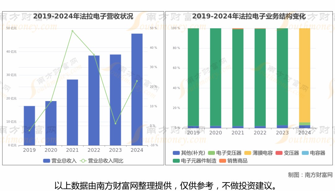 數(shù)據(jù)顯示(如上圖),法拉電子2024年營業(yè)收入為47.72億,同比增長22.99%,近5年復合年增長率26.04%。