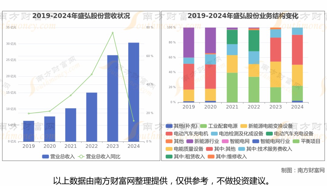 根據(jù)公司年度數(shù)據(jù)顯示(如上圖),2024年,盛弘股份實現(xiàn)營業(yè)總收入30.36億,同比增長14.53%,近5年復合年增長率40.85%。