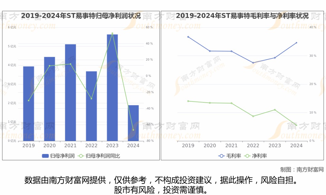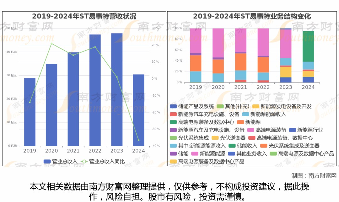 ST易事特年報數(shù)據(jù)顯示(如上圖),2024年實現(xiàn)營業(yè)總收入30.44億,同比增長-36.49%,近5年復合年增長率-3.39%。