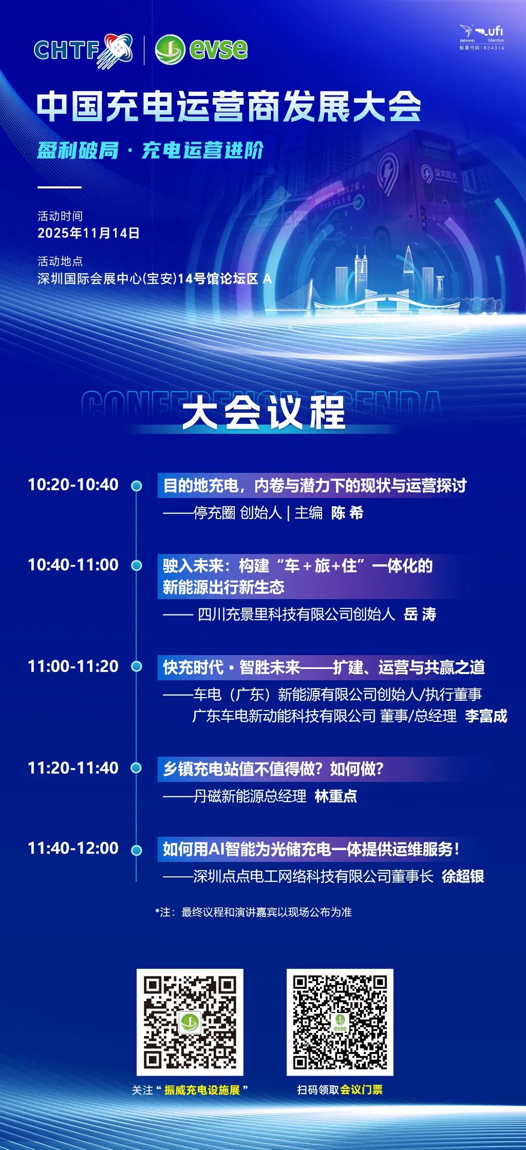 中國充電運營商大會將于11月14日在深圳國際會展中心(寶安)14號館館內(nèi)論壇區(qū)A召開。本次大會以“盈利破局·充電運營進階”為主題,得到了充電運營領(lǐng)域相關(guān)代表的大力支持,停充圈創(chuàng)始人/主編陳希、四川充景里科技有限公司創(chuàng)始人岳 濤、車電(廣東)新能源有限公司創(chuàng)始人/執(zhí)行董事、廣東車電新動能科技有限公司董事/總經(jīng)理李富成、丹磁新能源總經(jīng)理林重點、深圳點點電工網(wǎng)絡(luò)科技有限公司董事長徐超銀將出席本次論壇活動。