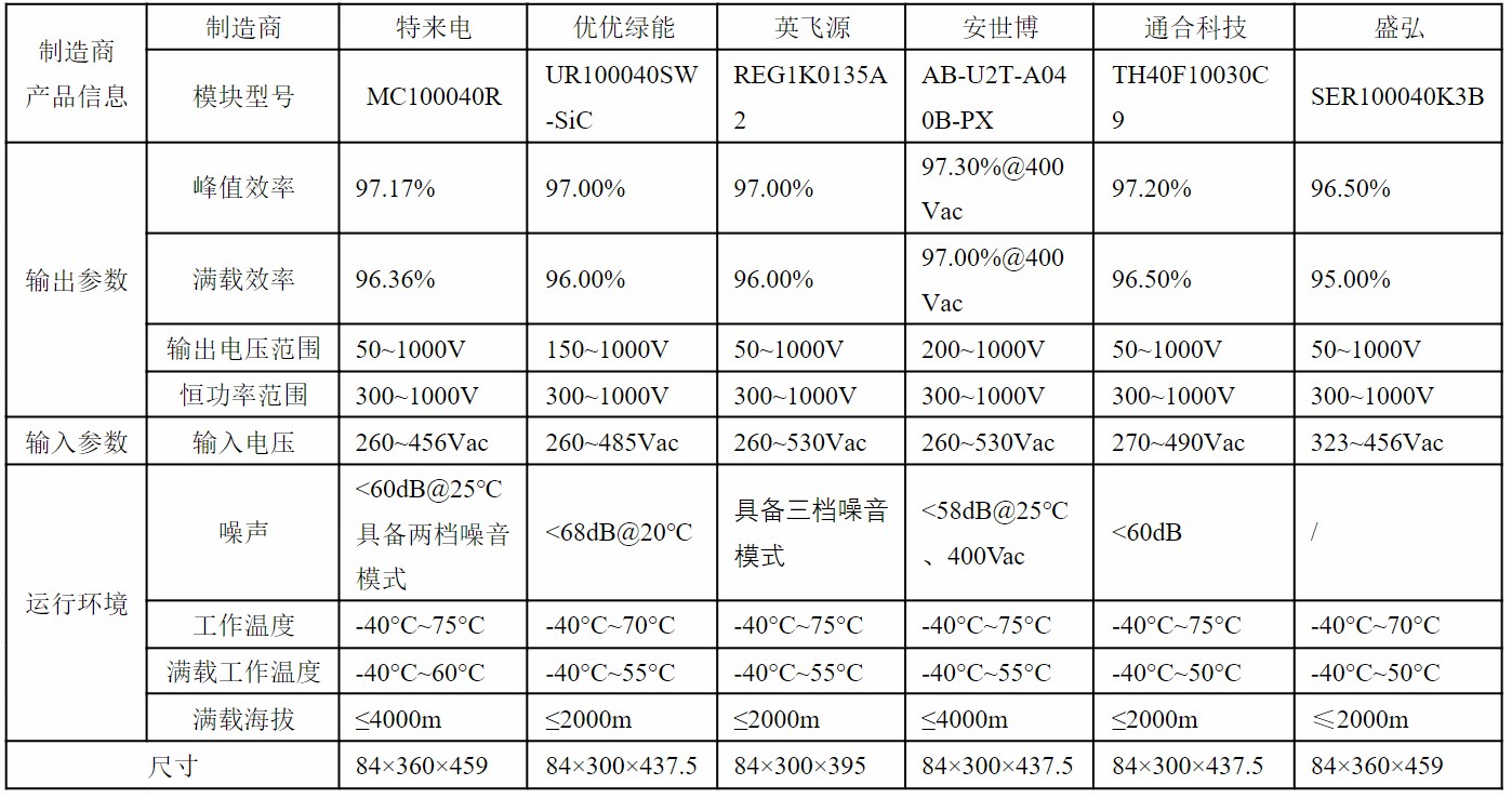 下表所示為業(yè)內(nèi)主流40kW SiC高效充電模塊主要參數(shù)對(duì)比: