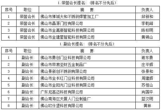羅明輝先生對下屆理事會班子提名:推薦“金嘉豪智能科技有限公司”陳標明董事長擔任榮譽會長;推薦“金建星智能科技有限公司”黃錦山董事長擔任榮譽會長;推薦“彩尼斯多智能科技有限公司”楊文泉董事長擔任執(zhí)行會長;推薦“百思德門控智能設備公司”汪志平董事長擔任執(zhí)行會長(原推薦日團五金塑料制品公司梁耀榮董事長擔任,梁董因工作繁忙表示謙讓);推薦“金鴻星智能科技公司”金國建董事長擔任監(jiān)事長;推薦“鷹鋒五金制品公司”羅福林董事長擔任副監(jiān)事長;推薦“晶源門控公司”官衛(wèi)林總經(jīng)理負責協(xié)會黨建工作;推薦“中國伸縮門網(wǎng)”程子芬擔任協(xié)會副秘書長,協(xié)會專職秘書長暫時空缺;秘書處秘書兼財務許少燕繼續(xù)留任;其余常務副會長、副會長成員繼續(xù)留任,其余理事會成員繼續(xù)留任,本屆監(jiān)事任下屆理事,以上提名獲得理事會鼓掌通過。
