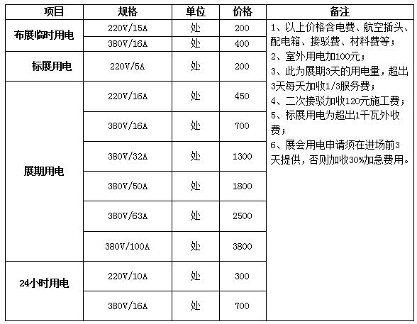 d、展期用電收費(fèi):請(qǐng)?jiān)敿?xì)閱讀《山東國際會(huì)展中心商業(yè)運(yùn)營有限公司服務(wù)價(jià)格表》第五項(xiàng):電箱接駁服務(wù)費(fèi)