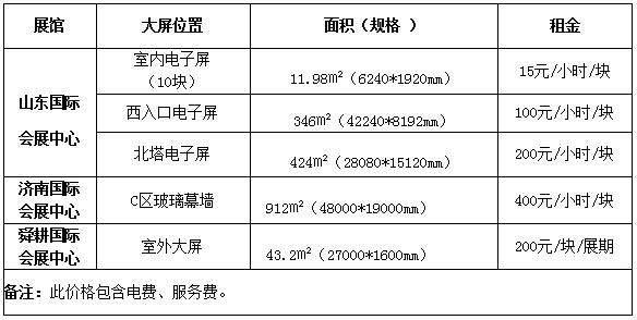注:展館從2020年8月起所有租賃價(jià)格已調(diào)整,請(qǐng)?jiān)敿?xì)收費(fèi)標(biāo)準(zhǔn)閱讀:《山東國際會(huì)展中心商業(yè)運(yùn)營有限公司服務(wù)價(jià)格表》 以下所有收費(fèi)標(biāo)準(zhǔn),最終解釋權(quán)歸:山東國際會(huì)展中心
