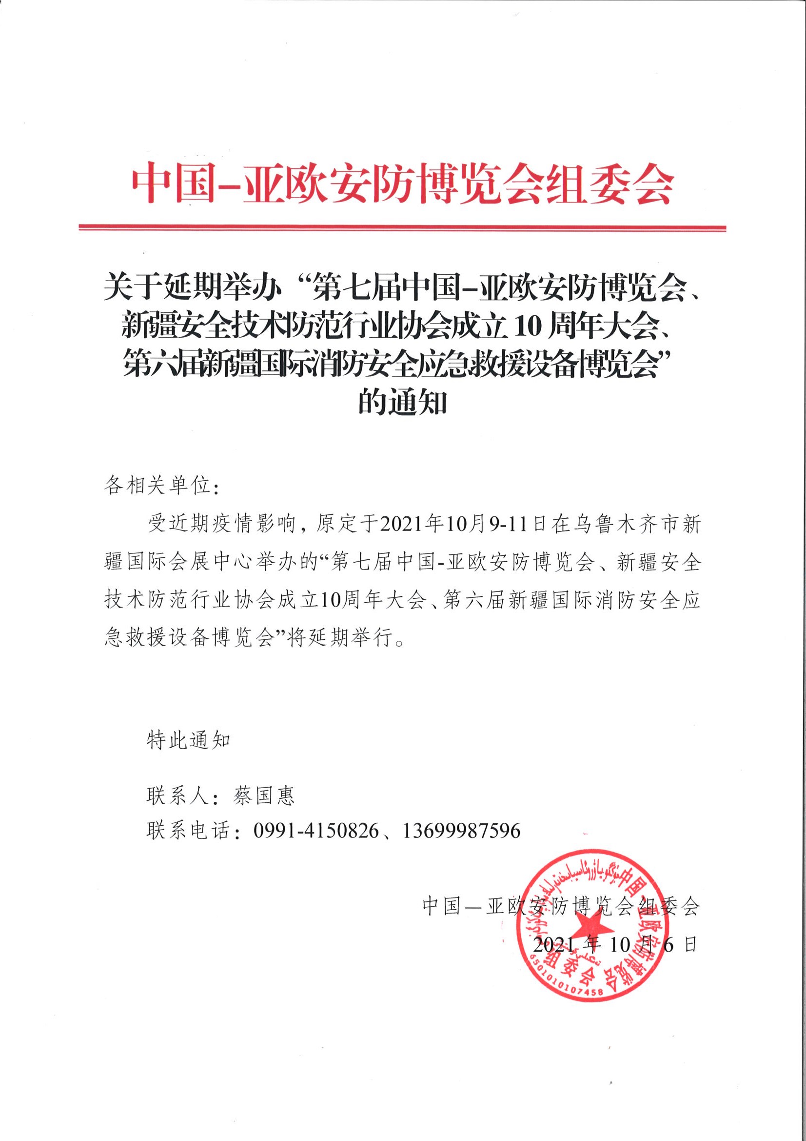 關(guān)于延期舉辦“第七屆中國一亞歐安防博覽會、新疆安全技術(shù)防范行業(yè)協(xié)會成立10周年大會、第六屆新疆國際消防安全應(yīng)急救援設(shè)備博覽會”的通知