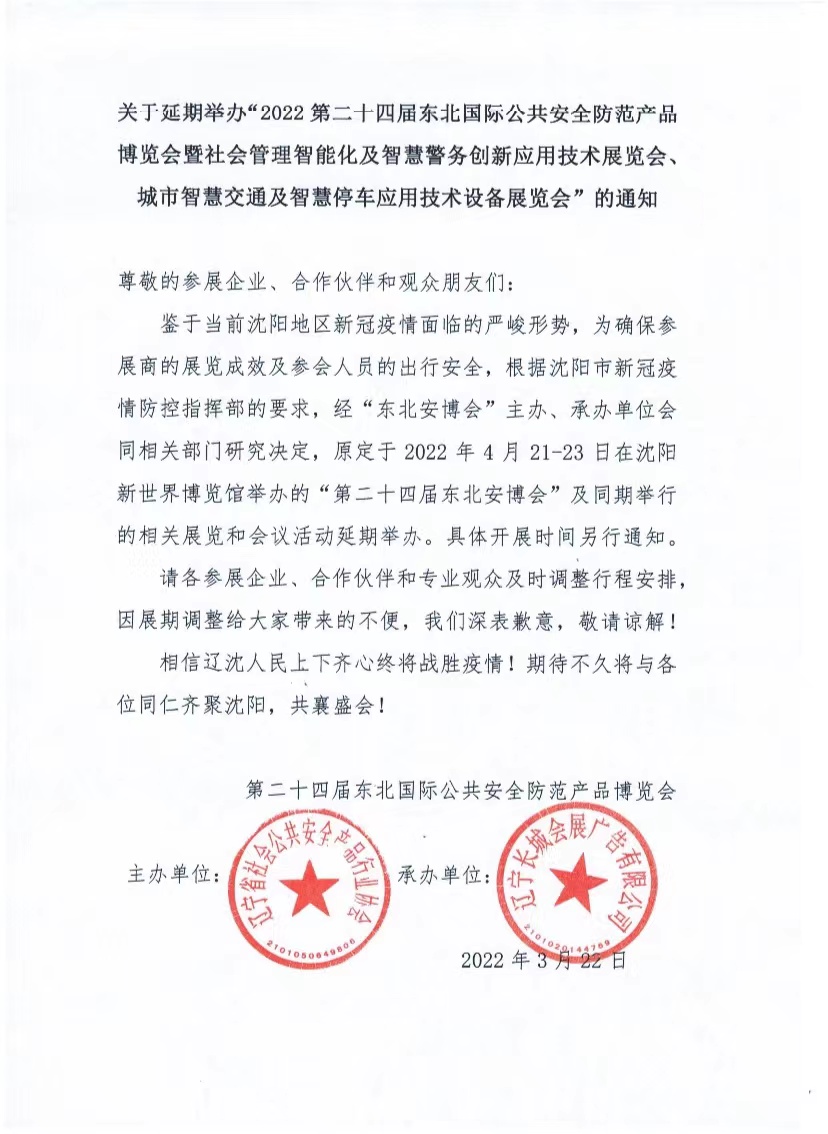 快訊:因疫情原因,原定于2022年4月21-23日在沈陽新世界博覽館舉辦的第二十四屆東北安博會(huì)將延期舉辦,具體開展時(shí)間另行通知。