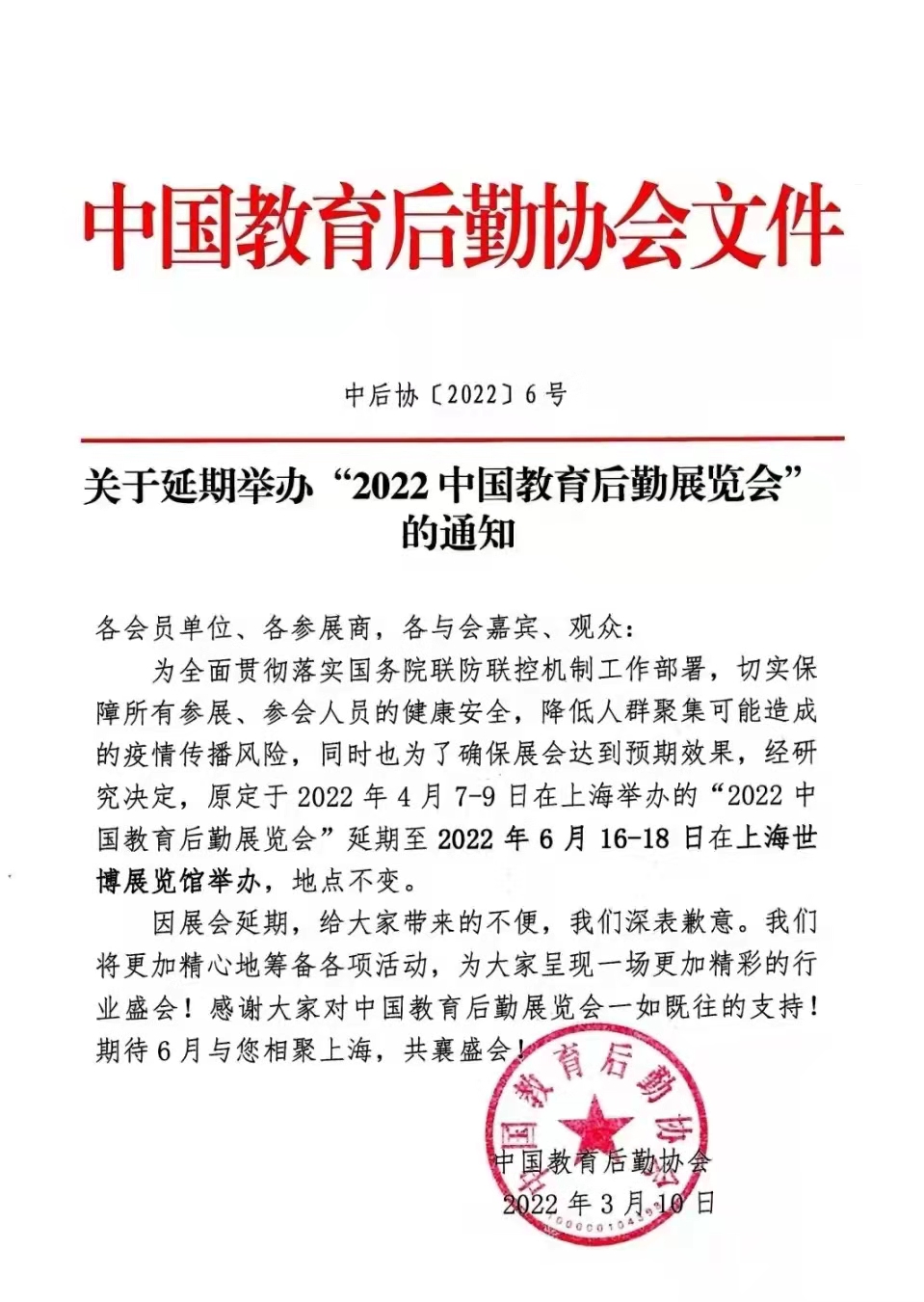 為全面貫徹落實國務院聯(lián)防聯(lián)控機制工作部署,切實保障所有參展、參會人員的健康安全,降低人群聚集可能造成的疫情傳播風險,同時也為了確保展會達到預期效果,經(jīng)研究決定,原定于2022年4月7-9日在上海舉辦的“2022中國教育后勤展覽會”延期至2022年6月16-18日在上海世博展覽館舉辦,地點不變。