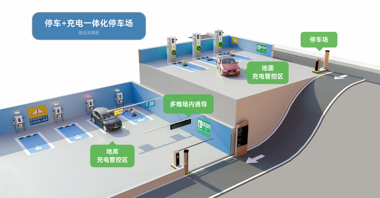 (捷順科技停車+充電一體化停車場建設(shè)效果圖)