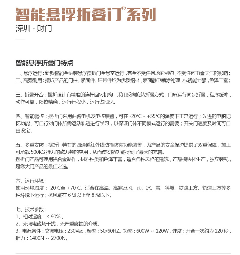 一、懸浮運(yùn)行:新款智能全拼裝懸浮擺折門(mén)全懸空運(yùn)行,完全不受任何地面制約,不受任何雨雪天氣的影響;