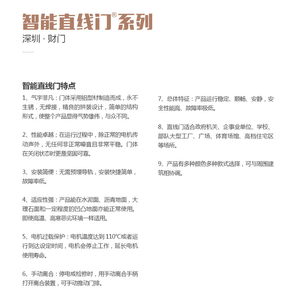 8、直線門適合政府機關(guān)、企事業(yè)單位、學(xué)校、部隊大型工廠、廣場、體育場館、高檔住宅區(qū)等場所。