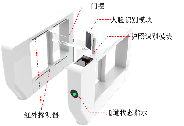 設備主要包含門擺、機箱、人臉識別模塊、護照識別模塊、紅外探測等