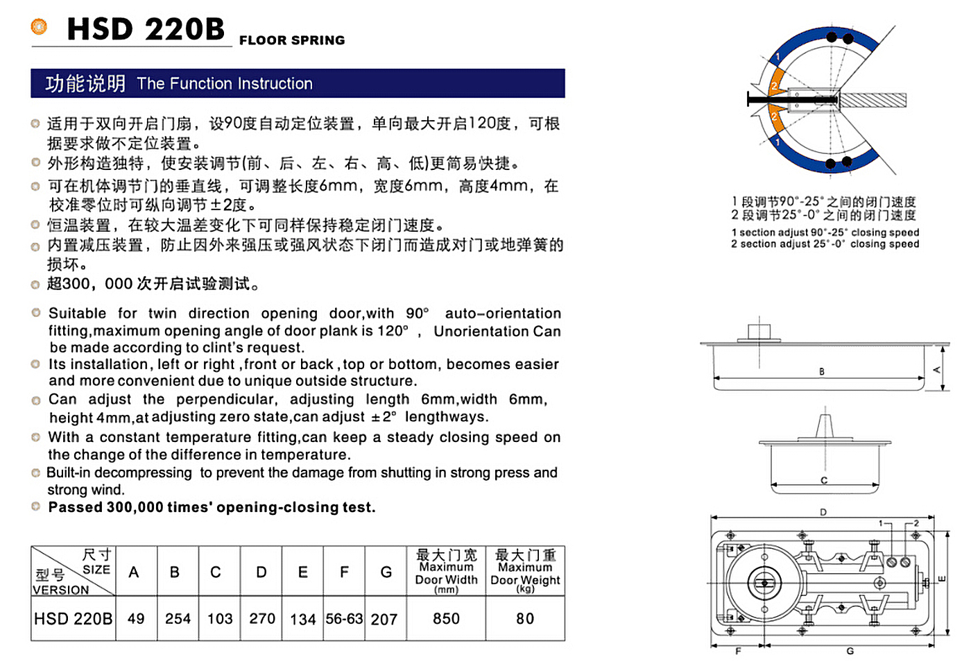 主要特點: 適用于雙向開啟門扇,設90度自動定位裝置,單向最大開啟120度,可根據(jù)要求做不定位裝置。
