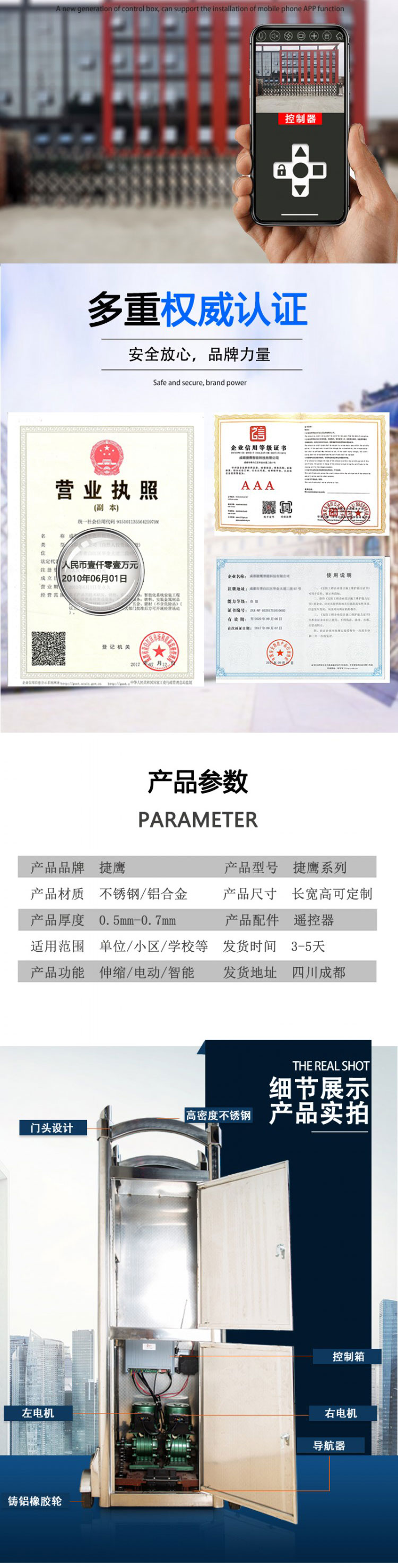 不銹鋼自動伸縮門產(chǎn)品,請仔細(xì)瀏覽本頁面。如您還有疑問,請撥打服務(wù)電話,我們將免費為您提供不銹鋼自動伸縮門的款式、價格、生產(chǎn)廠家、安裝維修等方面的咨詢服務(wù)。