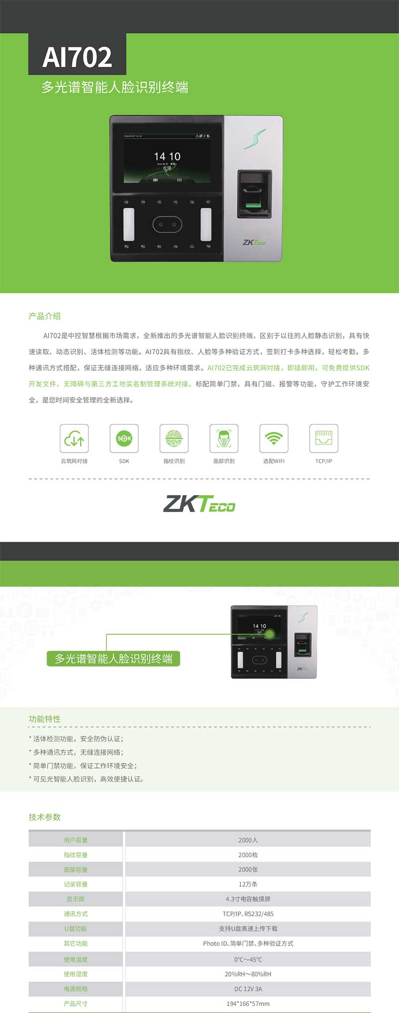 產(chǎn)品名稱:多光譜智能人臉識別終端AI702