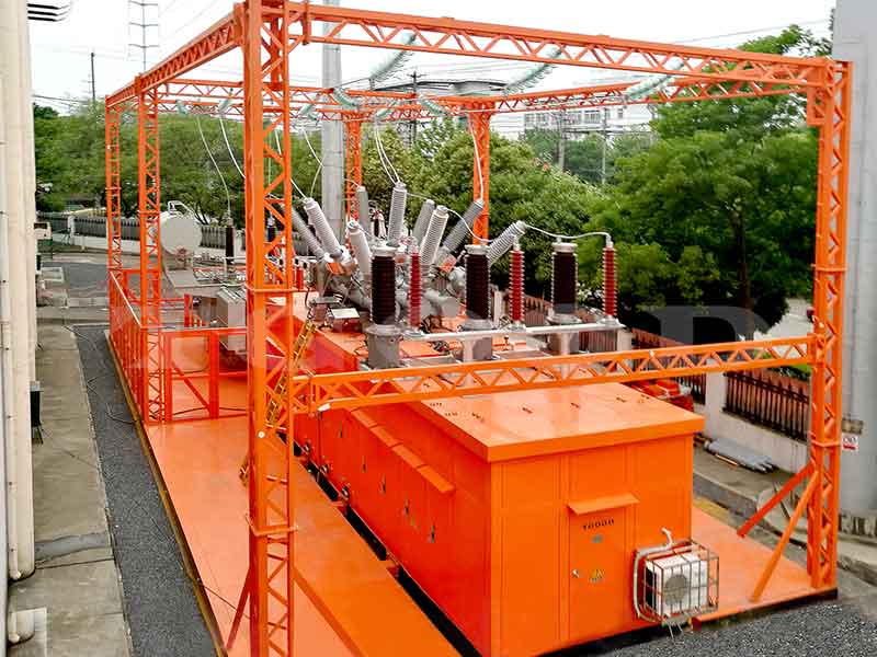 移動變電站含主變壓器、高壓設(shè)備、中壓設(shè)備、二次設(shè)備,所有設(shè)備自帶鋼制底座,一二次線纜側(cè)近側(cè)出,運抵現(xiàn)場后無需制做基礎(chǔ),只需將原站改造部分負荷轉(zhuǎn)移到移動變中即可,現(xiàn)場工作量極小,布局靈活、可快速投運。