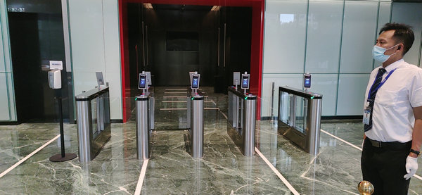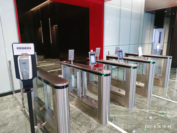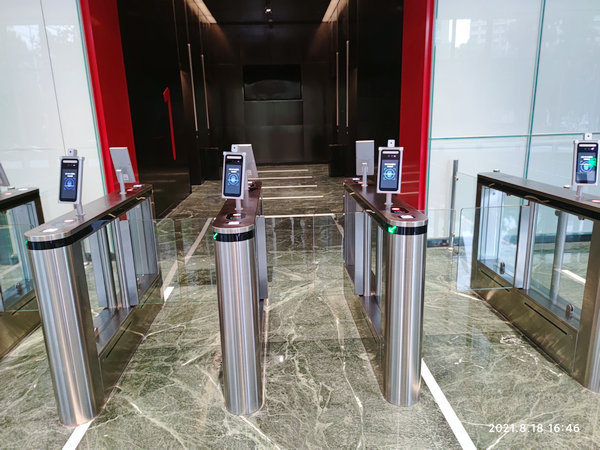 電梯廳安裝四組人臉識別測溫閘機通道