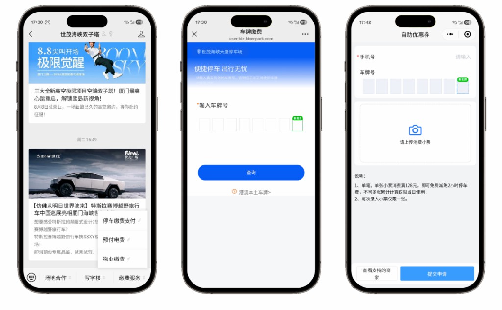 為海峽大廈商戶提供“停車+消費”聯(lián)動運營,將百勝泊充停車小程序植入海峽大廈公眾號,并定制電子優(yōu)惠劵,將原有的“人工審核消費小票”升級為“AI識別消費小票”,實現(xiàn)數(shù)字化登記、可追溯管理,大大提升響應(yīng)速度和車主體驗。