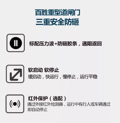 重型道閘門宜安裝壓力防砸或紅外防碰裝置,在升降過程中檢測到障礙物信號時可自動返回到一定距離或停止,以有效的保護(hù)過往人員、物體及車輛。