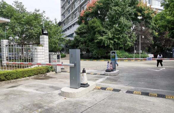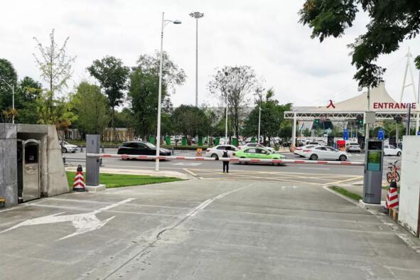 國航西南分公司停車場共設(shè)4進5出,全部采用銀色的藍卡LCD高速車牌識別道閘掃碼付一體機。