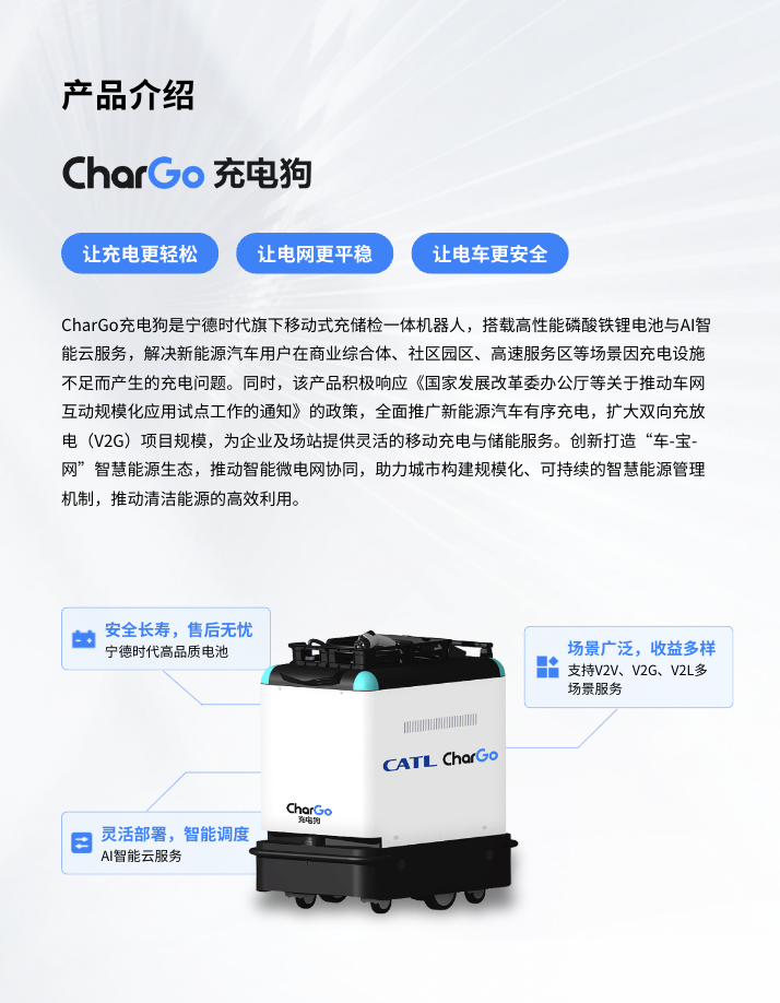 CharGo充電狗作為一款全場景移動式儲充檢一體機(jī)器人,為新能源車主與最后一公里的用電場景提供充電、儲能、電池檢測等一體化解決方案。它顛覆了傳統(tǒng)的“車找樁”模式,讓任意車位變成充電車位。用戶只需通過小程序一鍵預(yù)約充電,到達(dá)目的地后更新車位信息,即可享受便捷的充電服務(wù)。CharGo充電狗可實(shí)現(xiàn)自主駕駛,機(jī)身尺寸緊湊,可快速靈活部署到各類型室內(nèi)外停車場,充分利用低谷電價(jià),全天服務(wù),免去場地高額的電力擴(kuò)容改造成本。在充電性能方面,ChrarGo充電狗提供65kWh、55kW的充電功率,即給新能源車充10度電耗時(shí)約15分鐘,可增加70公里左右的續(xù)航里程。產(chǎn)品可用于辦公園區(qū)、住宅小區(qū)、商業(yè)綜合體、高速服務(wù)區(qū)等多樣化的應(yīng)用場景,對城市充電設(shè)施全覆蓋起到重要作用。