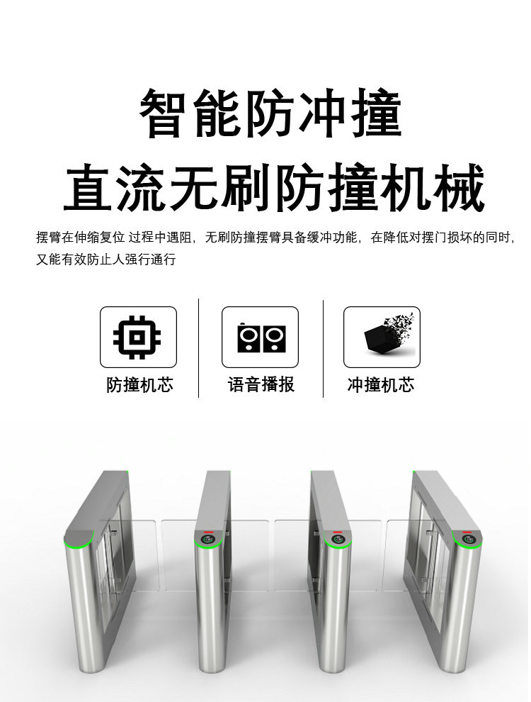 機(jī)械防撞設(shè)計:閘擺采用柔性材料(如聚氨酯)或彈性結(jié)構(gòu),受到外力撞擊時可緩沖卸力,減少設(shè)備損壞和行人受傷風(fēng)險。