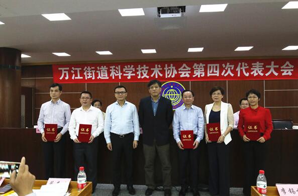萬(wàn)江黨委副書(shū)記、辦事處主任譚全河(左一)為新一屆科協(xié)主席劉沛林(右一)頒發(fā)證書(shū)