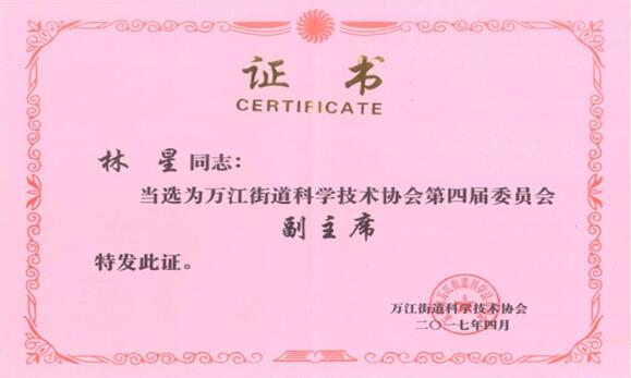 萬(wàn)江科學(xué)技術(shù)協(xié)會(huì)第四屆委員會(huì)副主席證書(shū)——廣東西奧物聯(lián)網(wǎng)科技林星董事長(zhǎng)