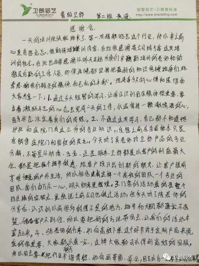 這是一次難忘而充實的集訓,一次讓夢想起航的財富之旅,千言萬語最終匯成“感恩”二字,學員們難以抑制心中的感激之情,寫下一封封感謝信,感謝公司的關(guān)心與支持,感謝全體導師的教導,感謝公司工作人員的辛勤付出,感謝全體家人的相互幫助。