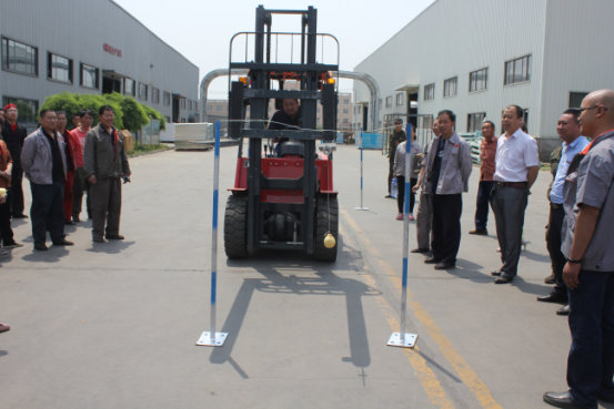 下面開始了正式的叉車技能賽,第一個(gè)環(huán)節(jié)為叉車?yán)@障礙,主要內(nèi)容為:木托盤上面4角擺4瓶紅茶,圍繞4個(gè)2米豎鐵架走s路1圈,保證紅茶不倒,鐵架不倒,看誰用時(shí)最少。H鋼電焊1人對(duì)護(hù)欄電焊1人,沖剪1人對(duì)組裝1人,噴塑1人對(duì)浸塑1人,靳廠長(zhǎng)對(duì)學(xué)廠長(zhǎng)共8人。